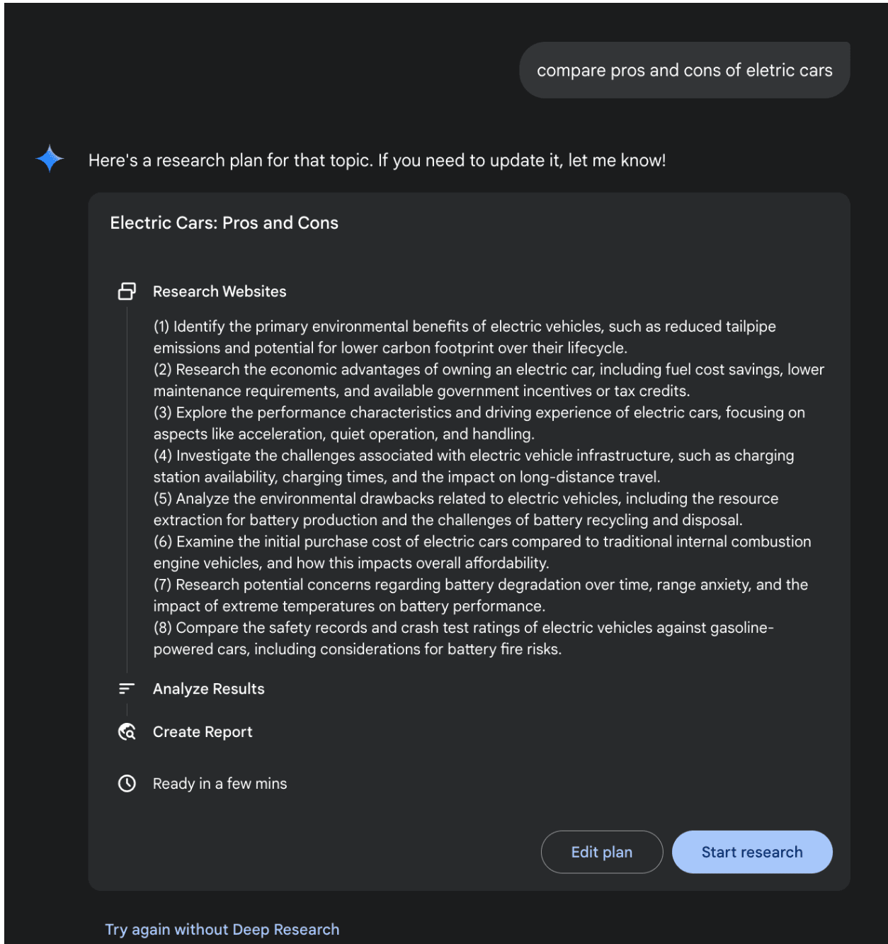 - Initial Exploration: It runs multiple, targeted searches based on your initial prompt.