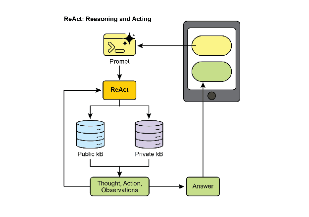 ReAct (Reasoning and Acting, see Fig. 3, where KB stands for Knowledge Base) is a paradigm that integrates Chain-of-Thought (CoT) prompting with an agent's ability to interact with external environments through tools. Unlike generative models that produce a final answer, a ReAct agent reasons about which actions to take. This reasoning phase involves an internal planning process, similar to CoT, where the agent determines its next steps, considers available tools, and anticipates outcomes. Following this, the agent acts by executing a tool or function call, such as querying a database, performing a calculation, or interacting with an API.