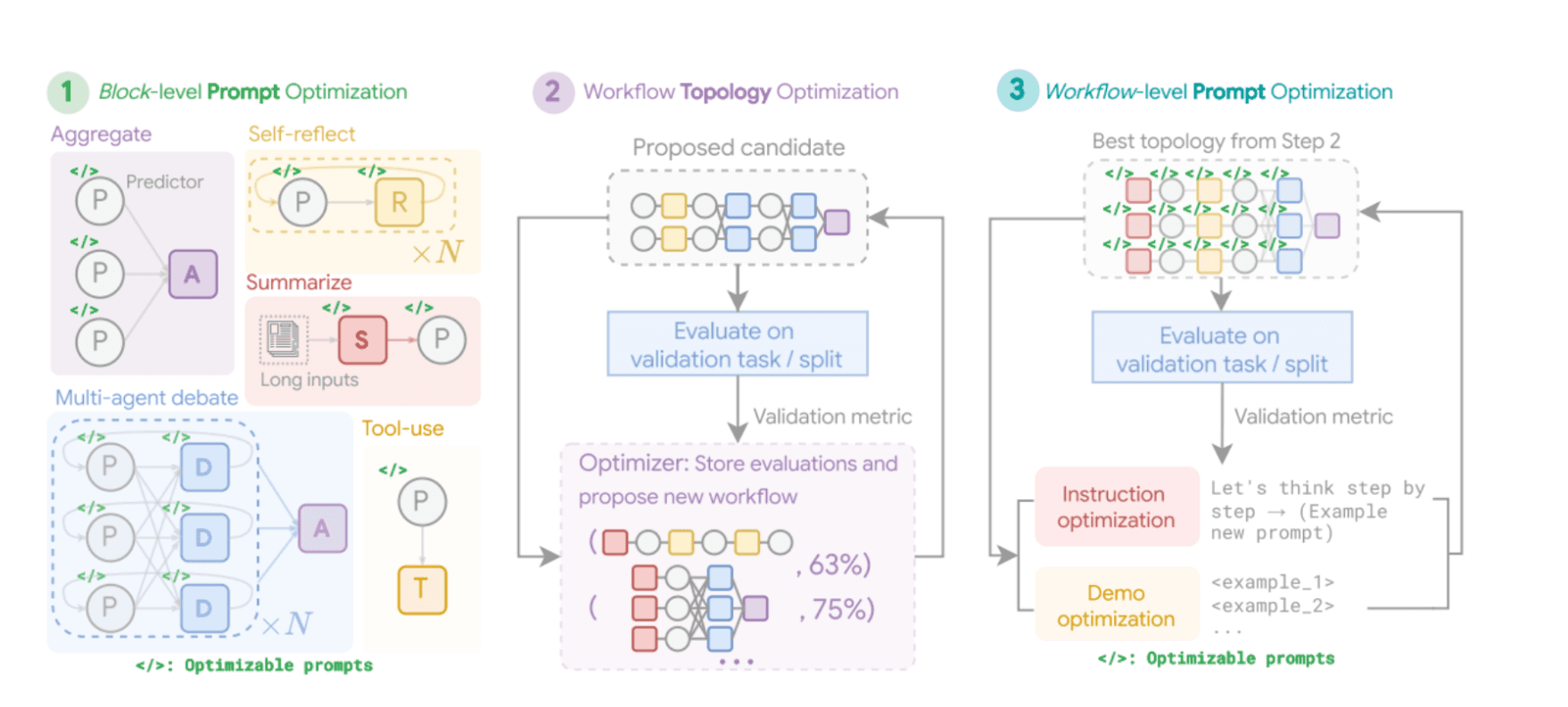 Fig. 4: (Courtesy of the Authors): The Multi-Agent System Search (MASS) Framework is a three-stage optimization process that navigates a search space encompassing optimizable prompts (instructions and demonstrations) and configurable agent building blocks (Aggregate, Reflect, Debate, Summarize, and Tool-use). The first stage, Block-level Prompt Optimization, independently optimizes prompts for each agent module. Stage two, Workflow Topology Optimization, samples valid system configurations from an influence-weighted design space, integrating the optimized prompts. The final stage, Workflow-level Prompt Optimization, involves a second round of prompt optimization for the entire multi-agent system after the optimal workflow from Stage two has been identified.